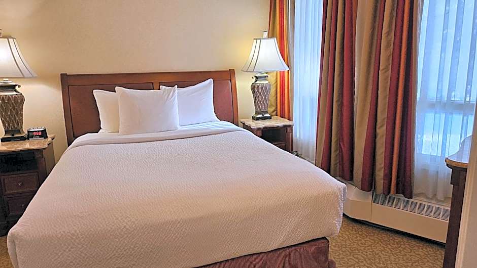 RECENTLY RENOVATED: 1 king bed in main bedroom, 1 queen murphy bed in living room. Kitchenette equipped with flat top stove, dishwasher, full size fridge/freezer, microwave, toaster oven, toaster, kettle and coffee maker (single serve Keurig). Our kitchenettes also include plates, bowls, cups, mugs, cutlery, and utensils such as a can opener, wine opener, spatula and whisk. Stainless steel pots and pans (unfortunately we do not offer a nonstick frying pan). Dish washer tablets, dish soap and dish towels. Salt and pepper is also provided. 4 piece bathroom with one person jet tub & separate glass shower. Gas fireplace & sitting area with island counter & stools. Balcony or patio. One 54″ flat screen television in living room and one 42” flat screen television in bedroom. Iron & ironing board, in room safe. Maximum occupancy: 4 people. Pet-friendly rooms available. Located in Building #5: 3 floors, elevator & exterior hall access. No air conditioning.