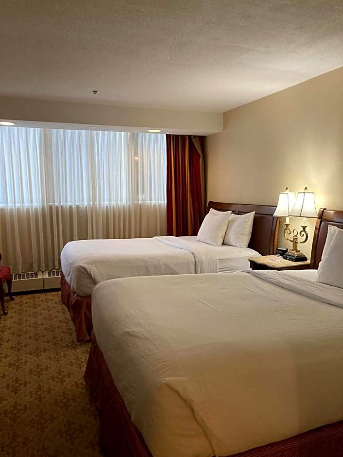 2 queen beds. All rooms are equipped with a mini fridge, coffee maker (single serve Keurig), kettle, writing desk & armchair, iron & ironing board & in room safe plus one 32″ flat screen television. 4 piece bathroom with bath/shower combination. Maximum occupancy: 4 people. Pet-friendly rooms available. Microwave is available on request. Located in Building #1, 3 floors, elevator & interior hall access - with interior pool view only (no window to the outside), or located in Building #2: 2 floors, exterior hall access, no elevator. No air conditioning.